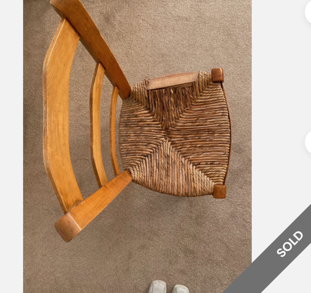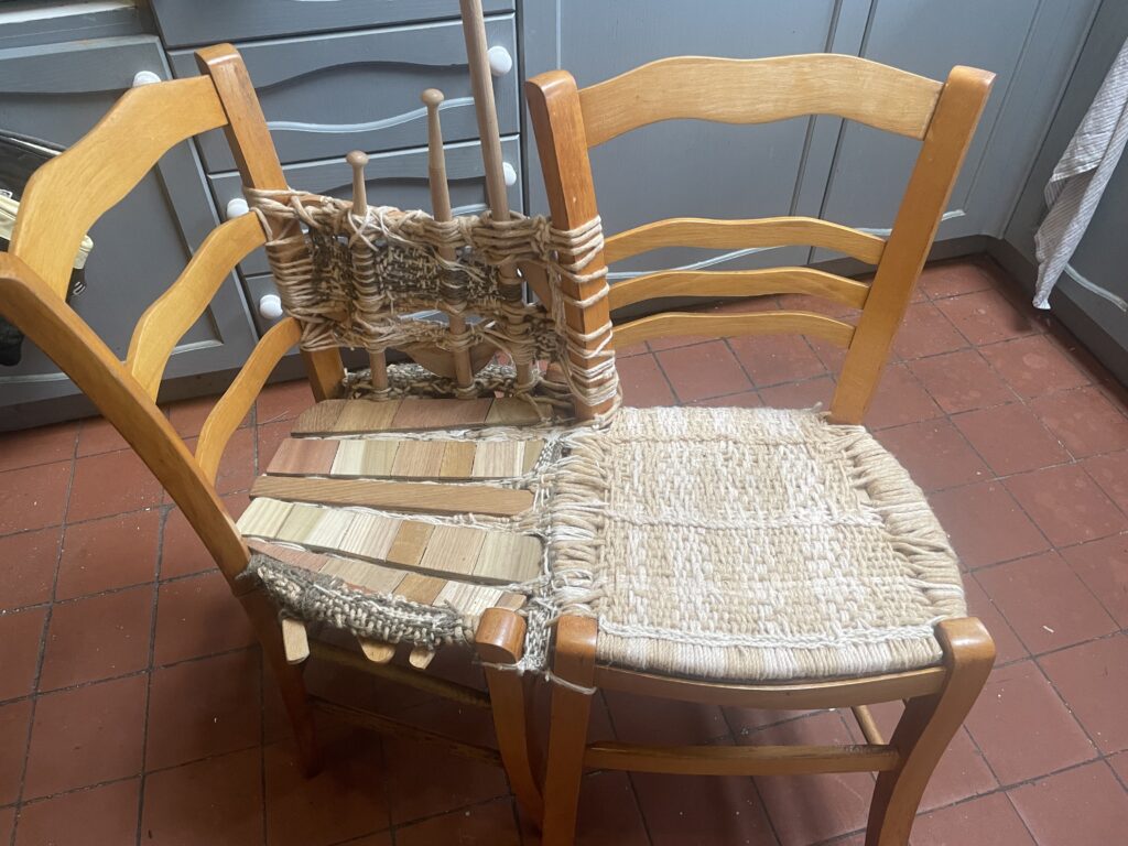 I’d seen old dining chairs made into benches and that’s what I fancied. Depending on the design, it might include cutting the chairs – so I was on the hunt for a pair of chairs with some visual interest to ‘upcycle’. I prefer to upcycle things that already need some work and I found a great pair of rush-seated chairs at a good price on eBay. The rush seating was frayed and broken – and would need to be replaced to be a usable seat or temporary home for clothes.