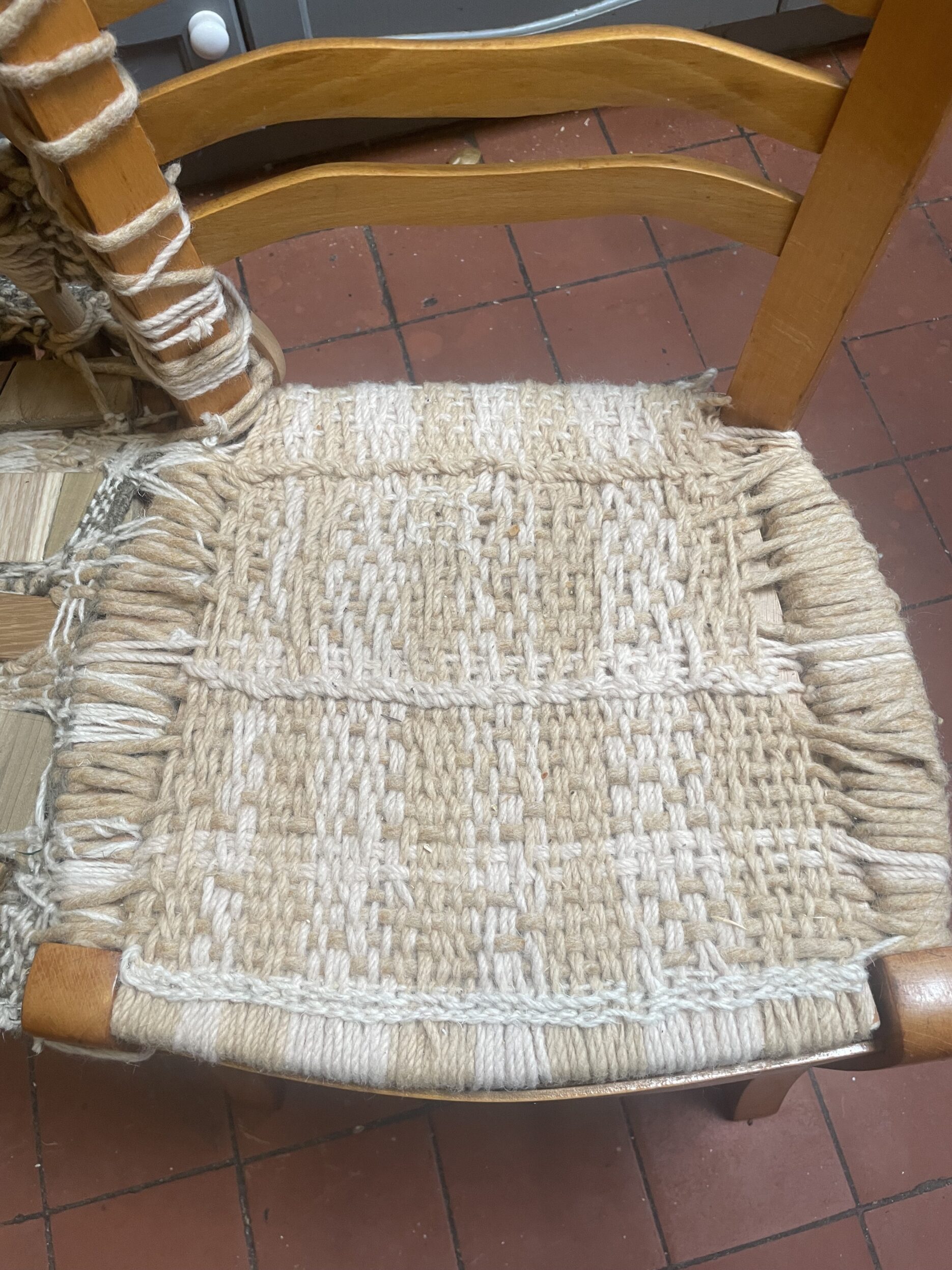 I knew the chairs needed to be able to return to their original form, so whatever I did had to be non-destructive and reversible. I also felt I wanted to honour the woven rush seating – but I had zero desire to mess around with that. Wool though – wool I can work with.